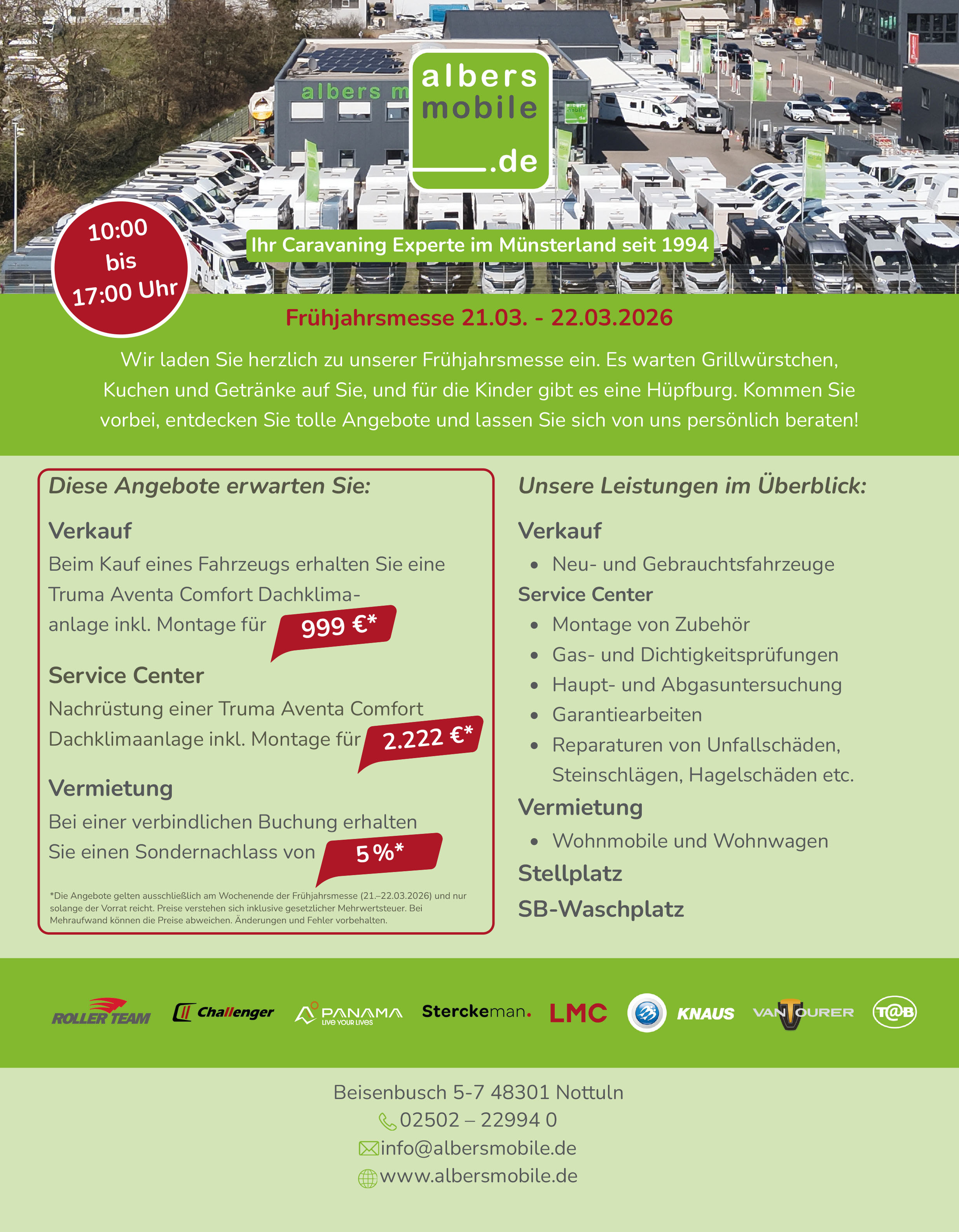 ![]() | Address Albers Mobile Service Centre/Workshop Nottuln Zeppelinstraße 6 48301 Nottuln | Contact us at info@albersmobile.de www.albersmobile.de | opening hours Mon - Fri: 09:00 - 13:00 14:00 - 17:00 Sat. - Sun.: Closed |